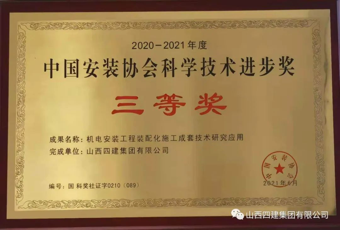 中国安装协会在南京组织召开2020~2021年度科学技术进步奖颁奖大会。山西贝斯特bst8888集团申报的《机电安装工程装配化施工成套技术研究应用》《农光互补光伏发电系统施工技术研究与应用》成果,荣获中国安装协会科学技术进步奖三等奖。
